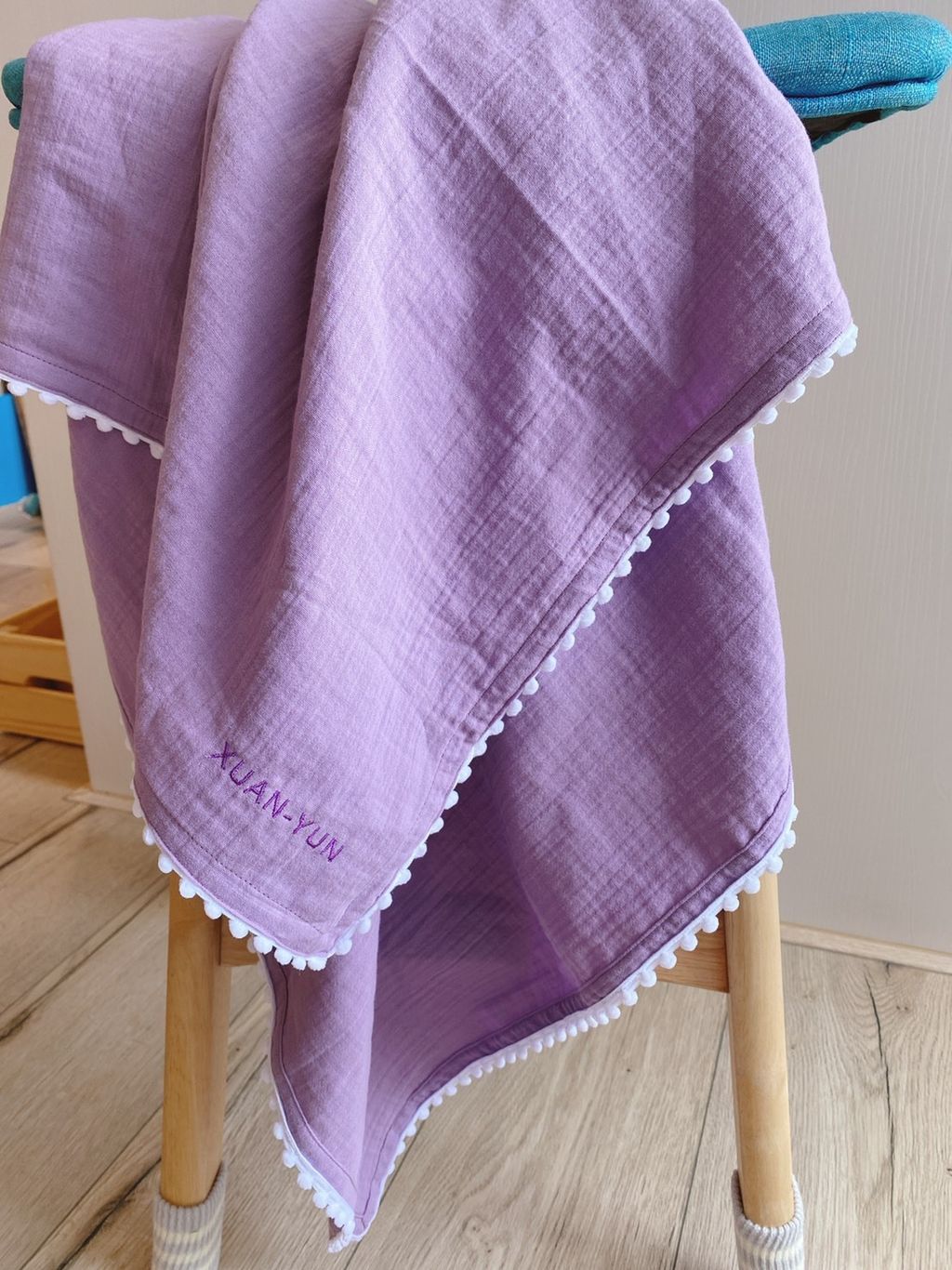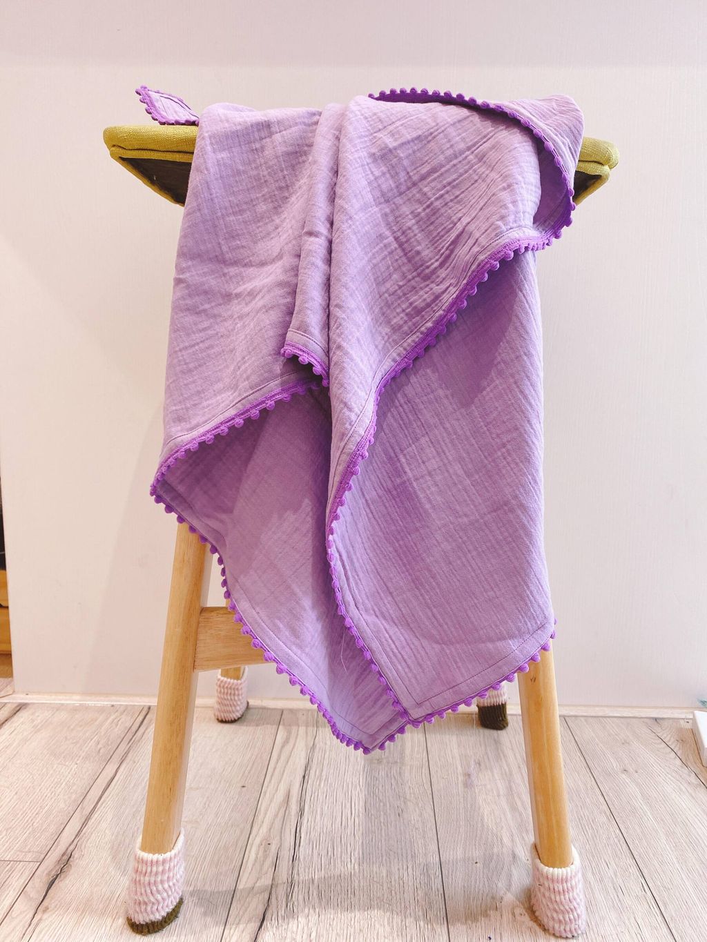 超適合在冷氣房裡使用,薄薄超透氣,可以檔風又不悶熱! 寶寶也超愛邊邊小毛球觸感!